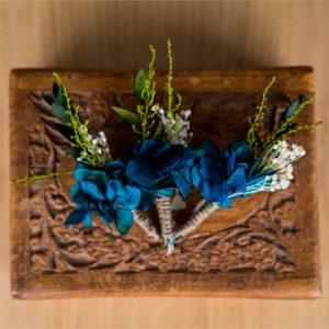 Desde que hablamos Pipi y yo conectamos, creamos los diseños a su elección con el color azul como base. El ramo de novia quedó espectacular, el azul lleno de color todo el ramo. El ramo trasmitía una luz preciosa, sencillo con base verde, paniculata blanca que ayuda al contraste, una peonia rosa, una hortensia azul y un lazo de terciopelo del mismo color para cerrar el conjunto.