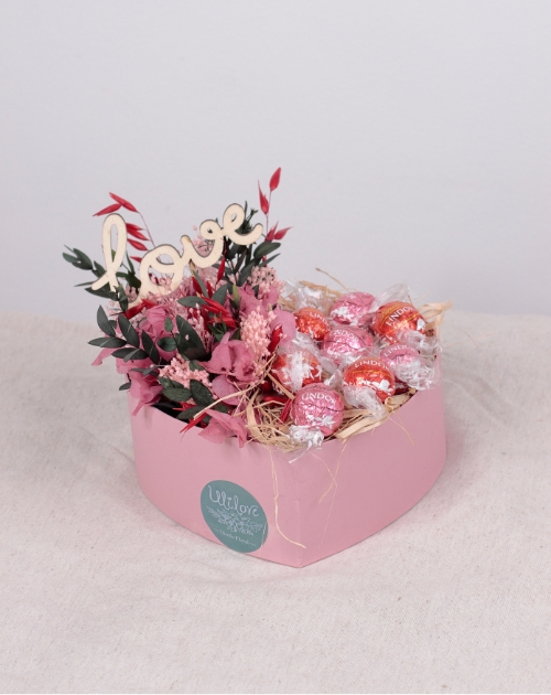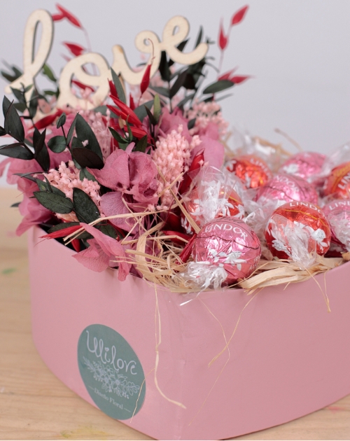 Se divide en dos mitades, una de flores preservadas, y otra de bombones