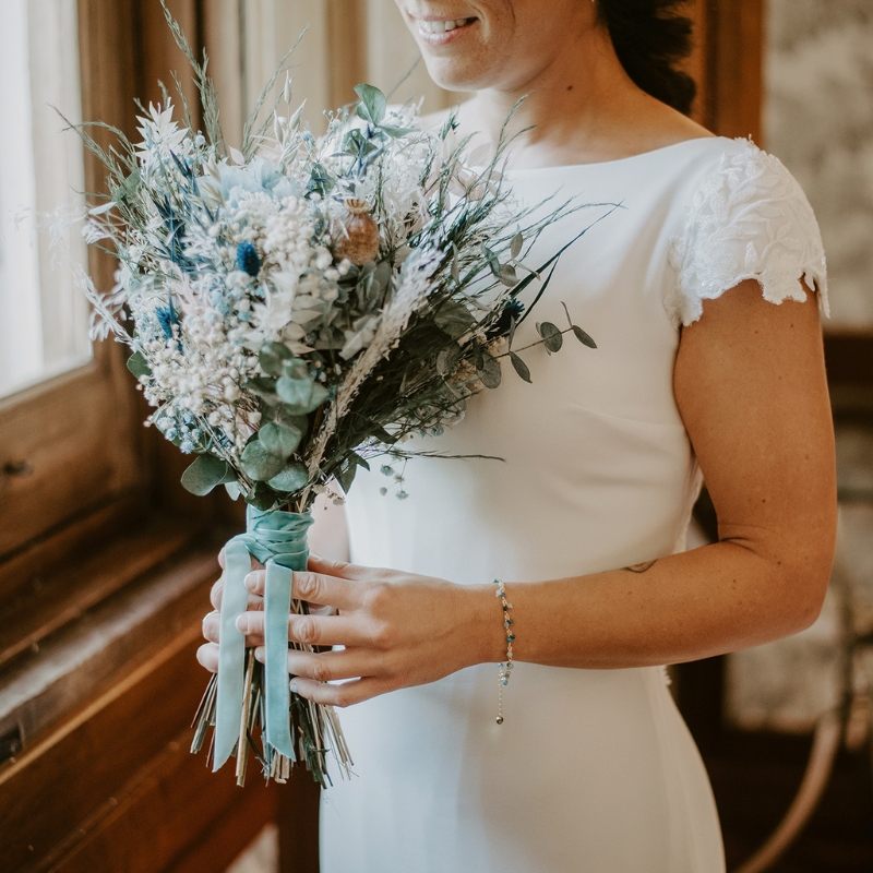 Un ramo liviano, muy silvestre y sencillo. Predomina el color blanco pero tienes pequeños destellos con flores azules junto con la lazada y el verde del eucalipto que le da ese toque de campo