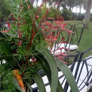 Para la decoración floral de la ceremonia, se realizó un arco con puntos florales asimétricos, una guirnalda y los ramilletes de las sillas que decoraban el pasillo central. La elección que finalmente se decidió fue la composición de Anthurium, Eucalipto Populus, Birch rojo, Lentisco Rojo, strelitzia, aspiditra y otros verdes como asparagus densiflorus.